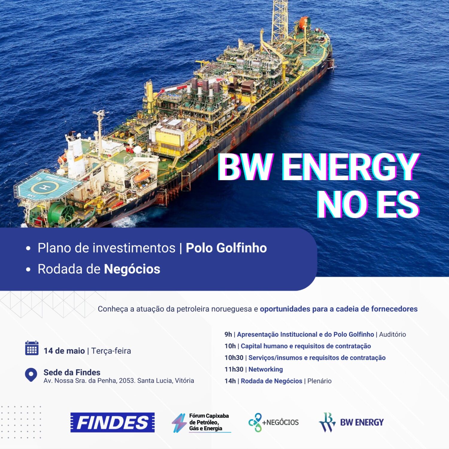 2º – À tarde, a partir das 14h, com o Programa Mais Negócios, será realizada a primeira Rodada de Negócios da BW Energy no Espírito Santo.